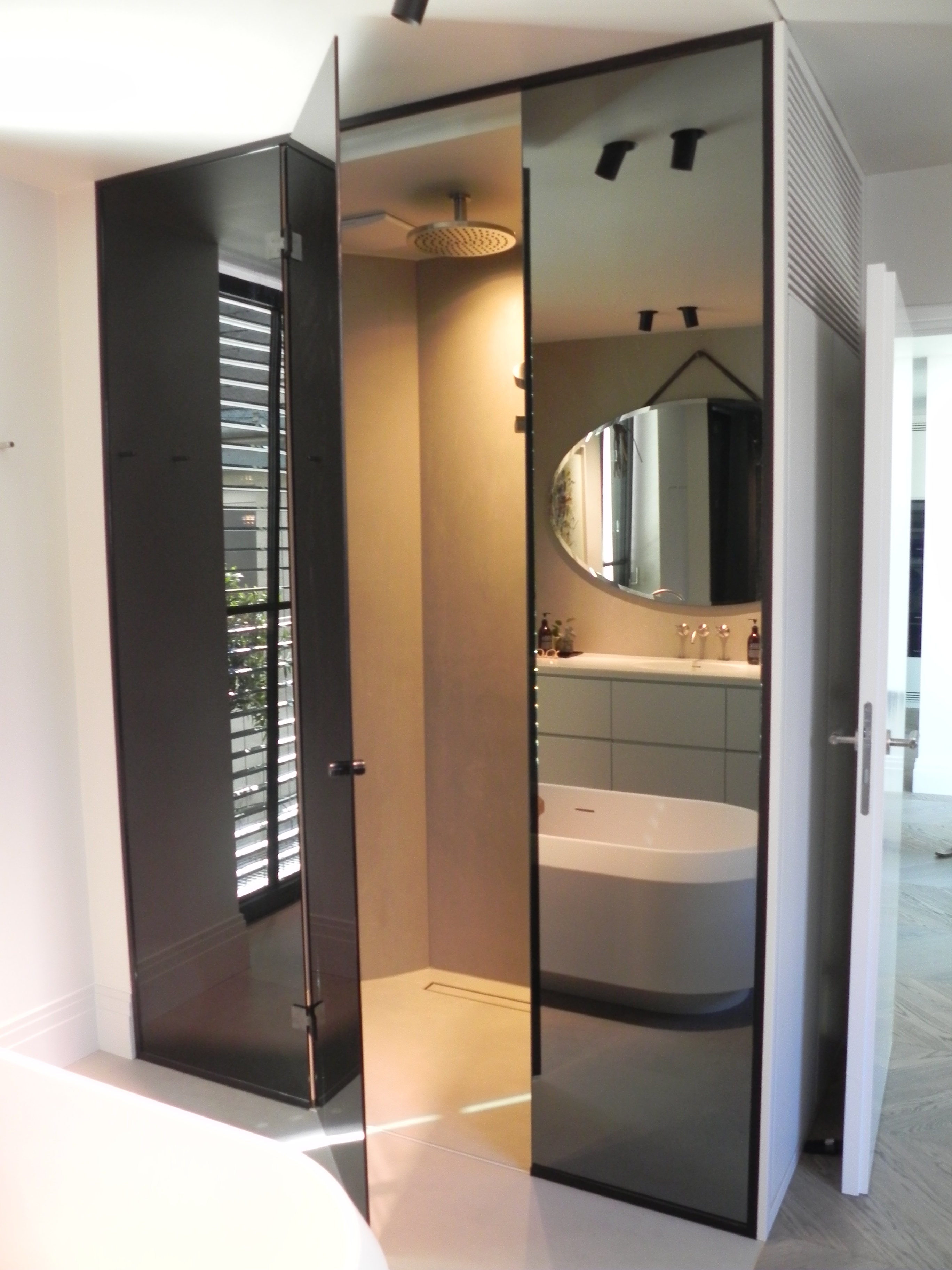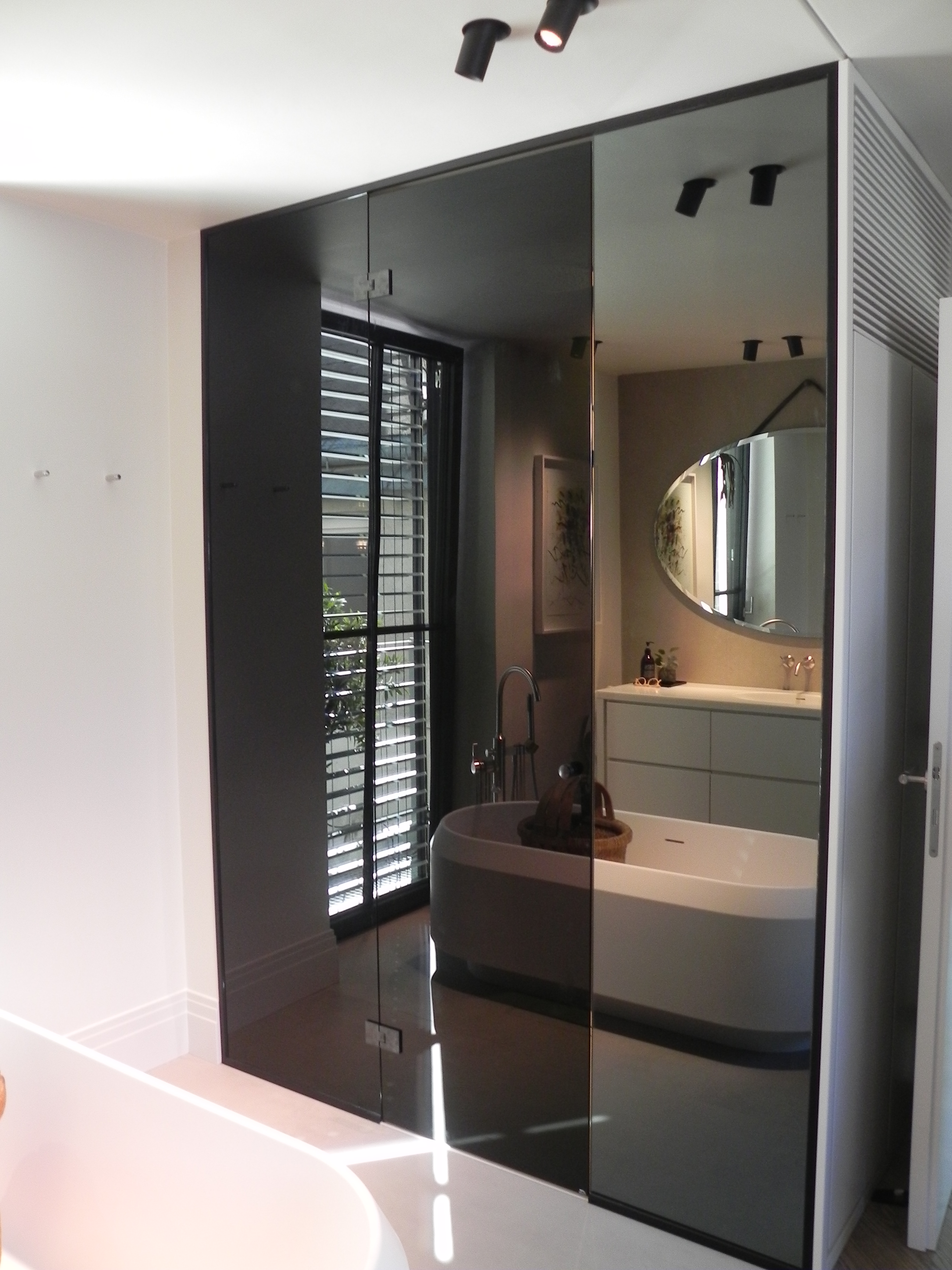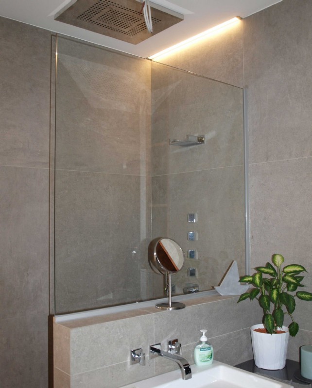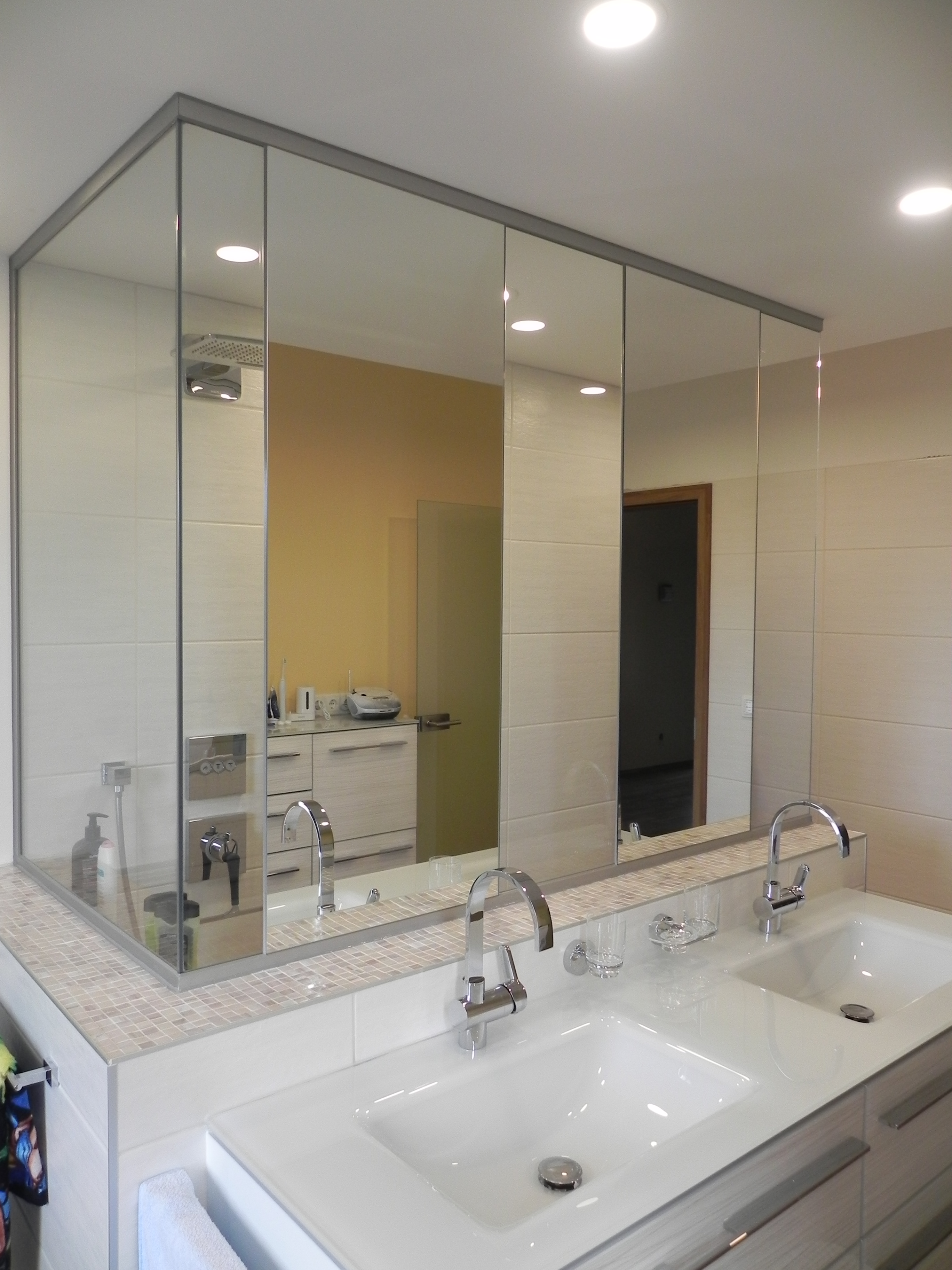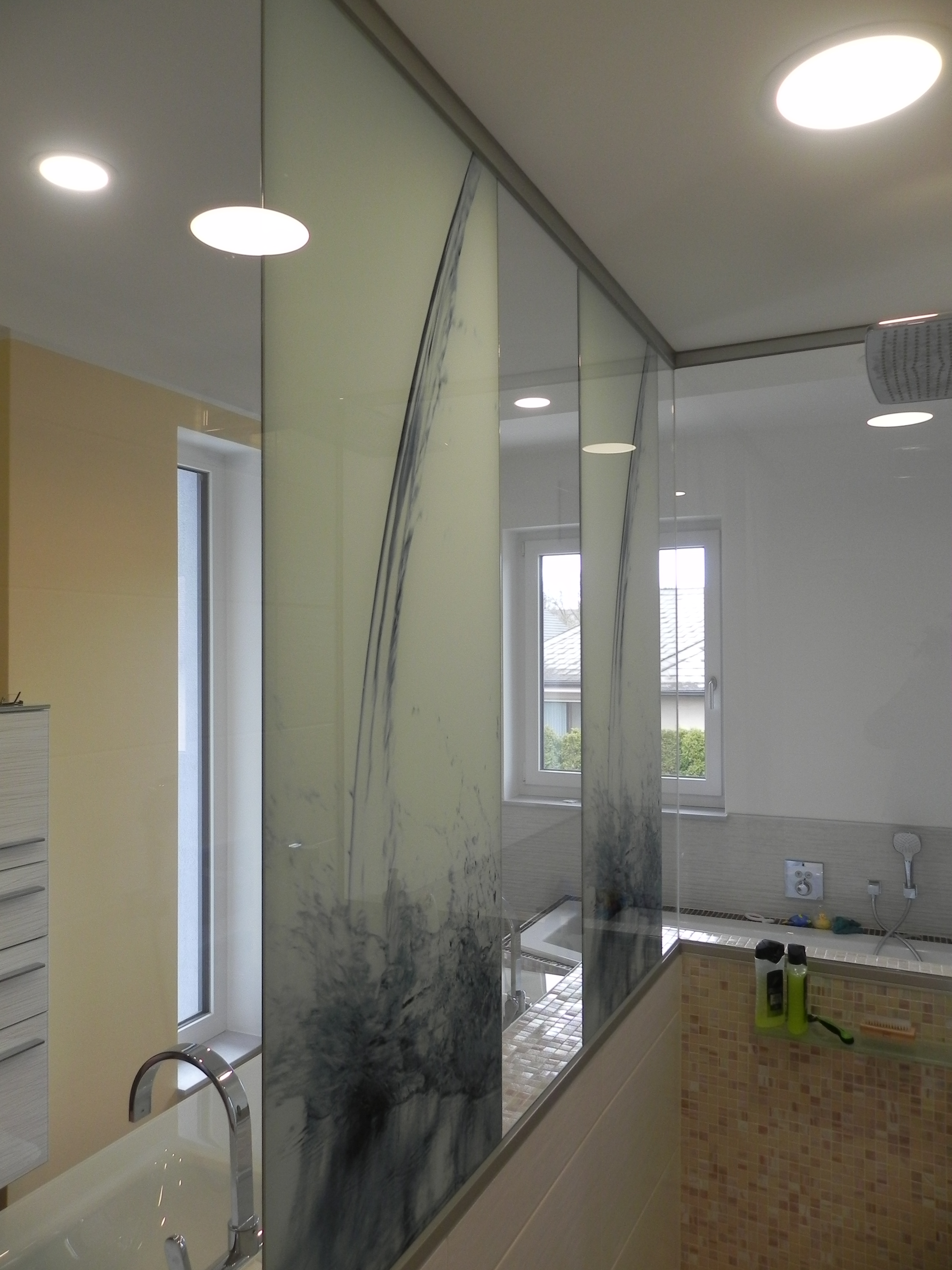 Spiegel auf Glastrennwand im Badezimmer